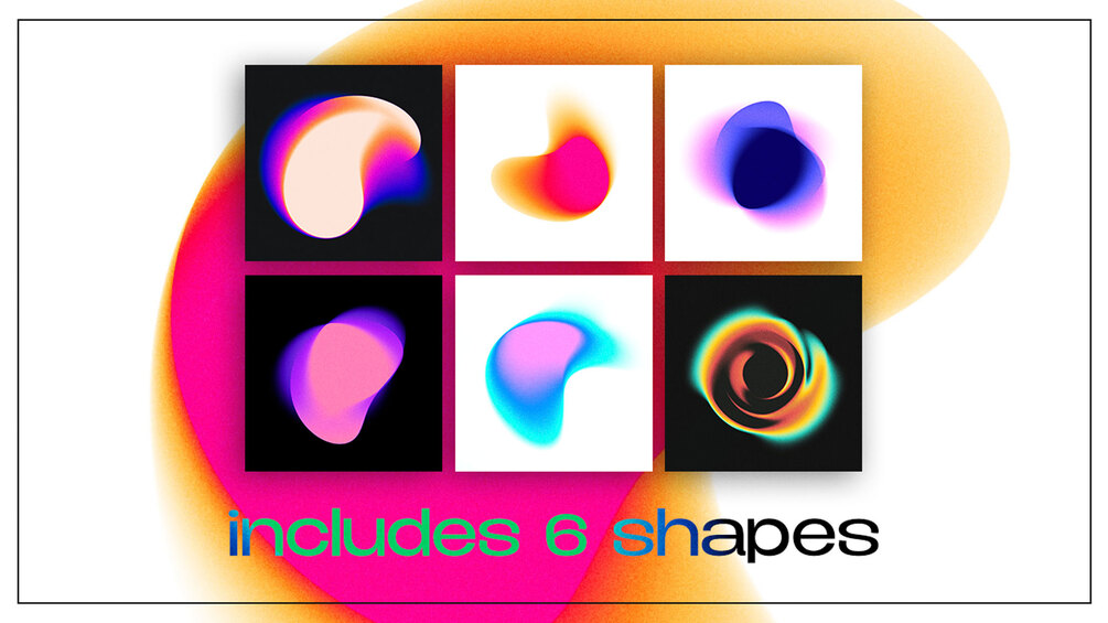 This starter pack includes 6 grainy abstract gradient shapes to use in your designs.